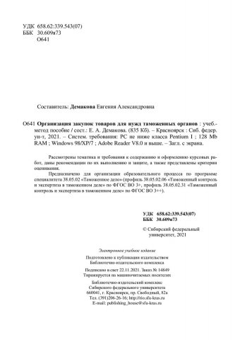 Библиографическое описание: Организация закупок товаров для нужд таможенных органов : учебно-методическое пособие / Сибирский федеральный университет, Институт торговли и сферы услуг ; сост. Е. А. Демакова. - Электрон. текстовые дан. (pdf, 0,9 Мб). - Красноярск : СФУ, 2021 (2021-10-25). - 26 с. - Загл. с титул. экрана. - Изд. № 2021-14849 : Б. ц. - Текст : электронный.
